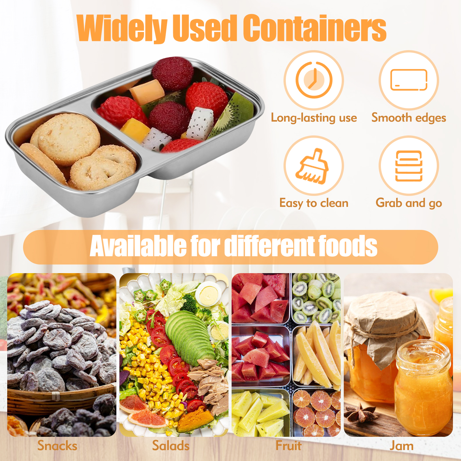 - Double Compartment Snack Containers: The stainless steel food container has two separate compartments. One has a capacity of 0.8cup/190ml, and the other has a capacity of 1.25cup/300ml, you have plenty of storage for your meal prep needs. Note: that the middle division cannot completely separate the two compartments, not suitable for holding liquids
